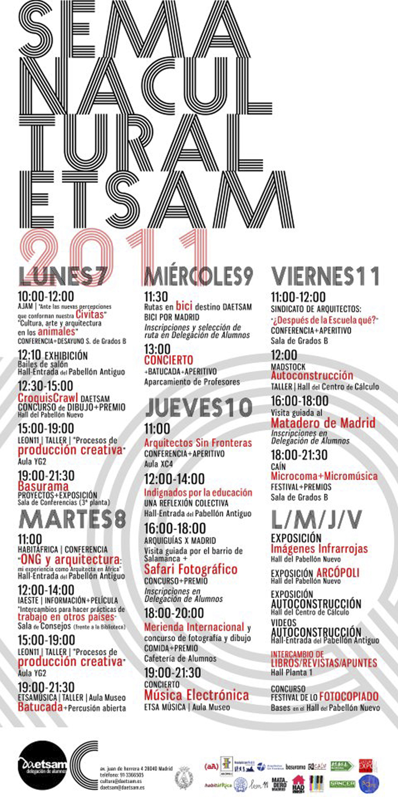 Del lunes 07 al viernes 11 de noviembre.- La Delegación de Alumnos de la Escuela Técnica Superior de Arquitectura de Madrid (ETSAM) ha elaborado, junto a otras organizaciones, una semana donde habrá cabida a diferentes manifestaciones artísticas como baile, talleres, exposiciones, ruta en bicicleta, etc.